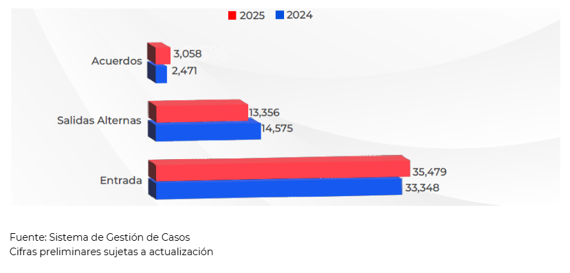 Al cierre de 2025, más de 13,300 casos se resolvieron mediante salidas alternas, lo que representa casi 4 de cada 10 casos penales. Este modelo se ha expandido a 14 departamentos judiciales, con prácticas más uniformes y mayor cobertura territorial. Solo en 2024 y 2025 se lograron más de 5,500 acuerdos, contribuyendo de manera directa a la reducción de atrasos y al uso más racional de la prisión preventiva.